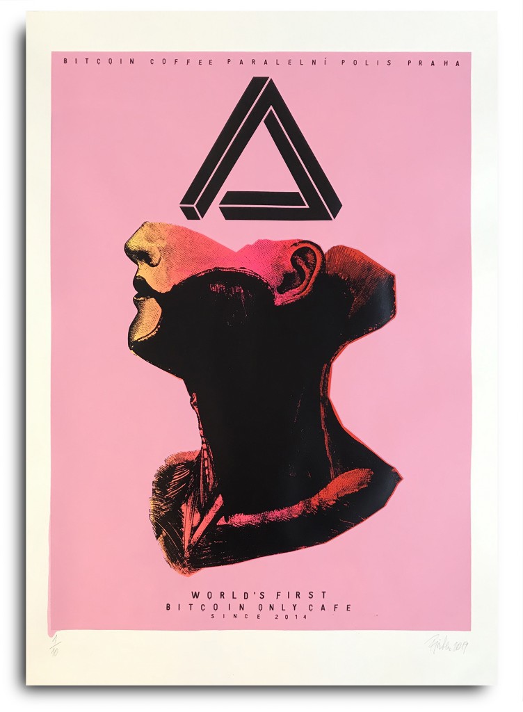 Cryptoposter Bitcoin Coffee Paralelní Polis, World’s First Bitcoin-only coffe since 2014, according to the Washington Post Printmaking: Screen Print, Acrylic on Paper.Print: 5 color print,